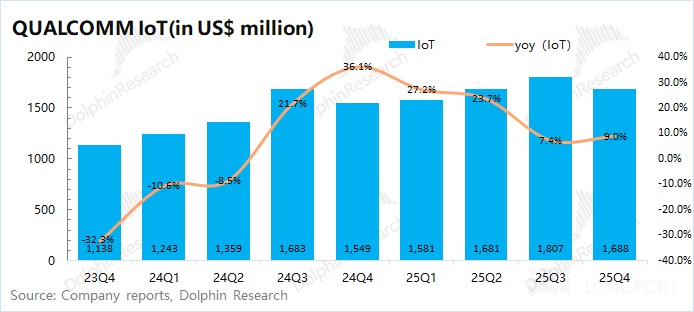 IoT revenue in Q1 FY2026 (25Q4) was $1.69bn, +9% YoY, in line with consensus ($1.7bn). After prior double-digit growth, IoT has slowed to single digits.
