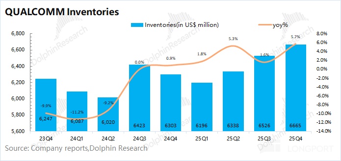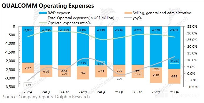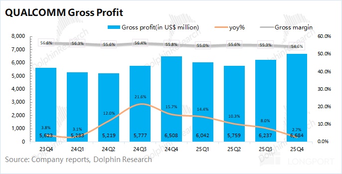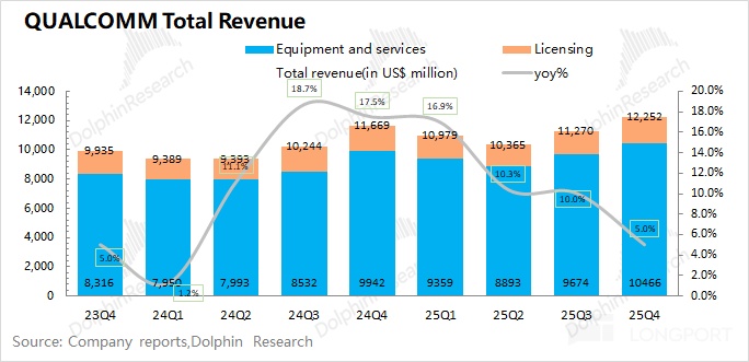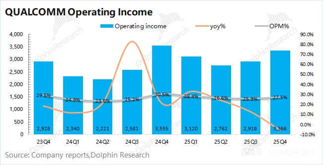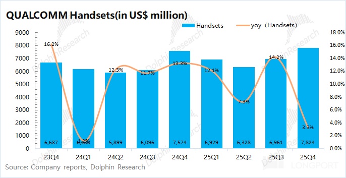 Handsets revenue in Q1 FY2026 (25Q4) was $7.82bn, +3.3% YoY, in line with expectations ($7.75bn). Dolphin Research attributes the slowdown to: ① the flagship Snapdragon 8 Elite Gen5 was launched a quarter earlier; ② a generally weak handset market.