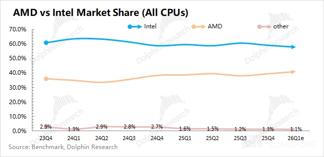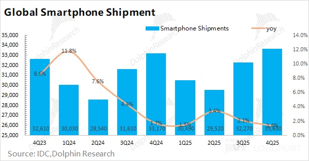 Based on guidance, Dolphin Research believes end-demand in handsets and adjacent markets remains soft, limiting restocking incentives. With memory shortages, inventory is likely skewed, with memory components in short supply.