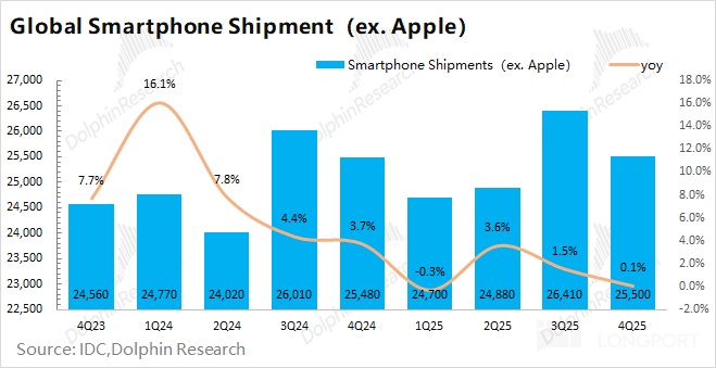 Industry data show that, with Apple’s spec bump at same price, ex-Apple smartphone shipments were 255mn units in 4Q25, roughly flat YoY, underscoring Android weakness.