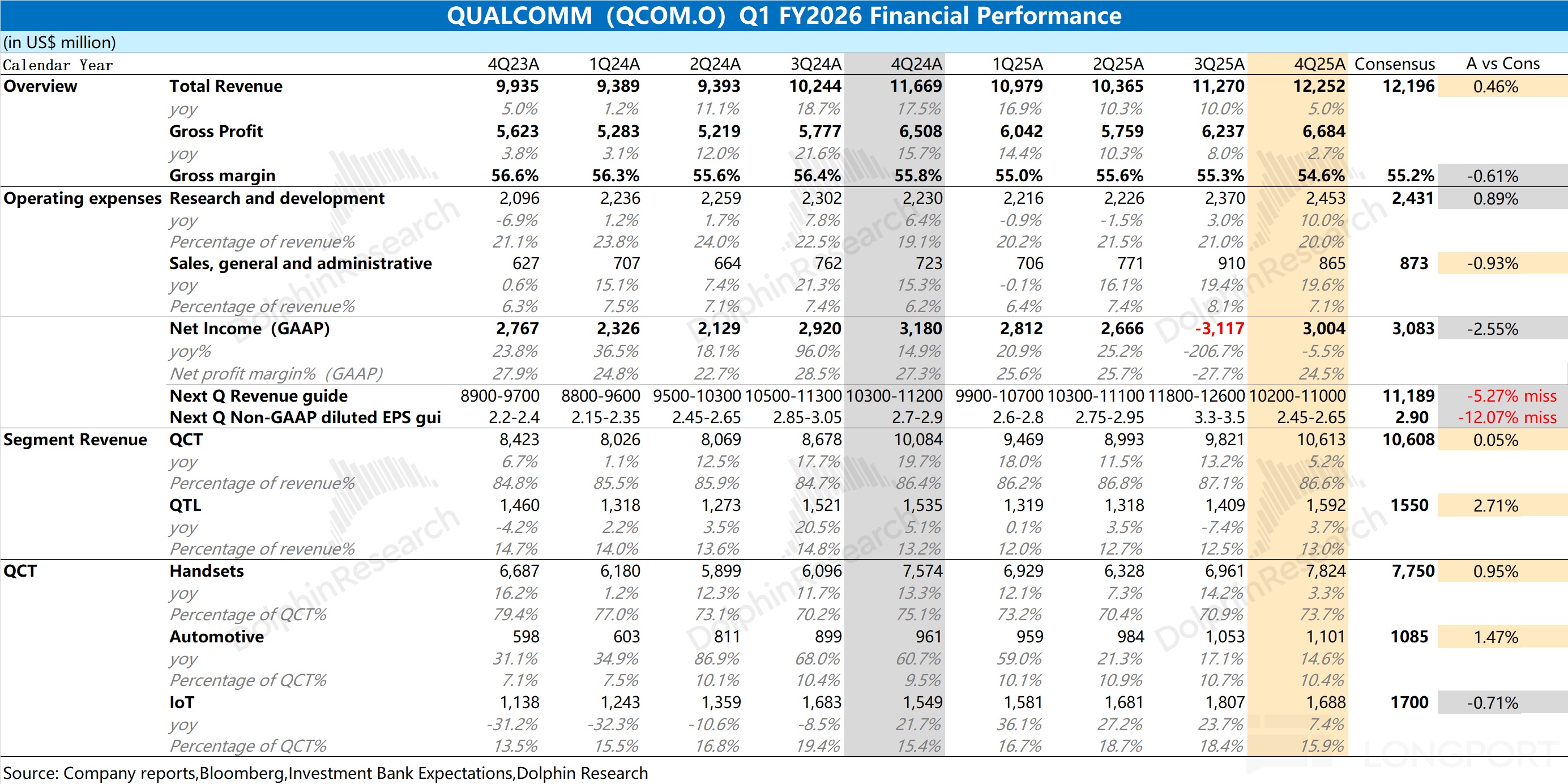 1) Headline numbers: Revenue was $12.25bn, +5% YoY, in line with consensus ($12.2bn). Growth decelerated again, mainly due to a sluggish downstream smartphone market. GPM was 54.6%, down 120bps YoY and below consensus (55.2%), pressured by memory tightness that weighed on QCT margins.