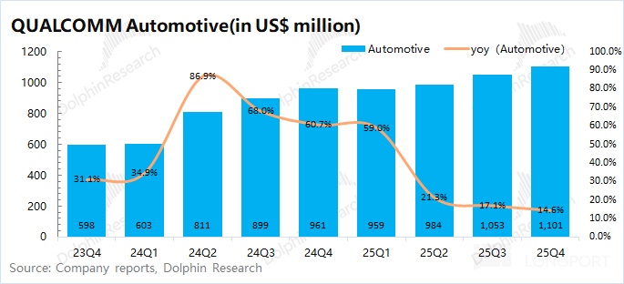 Auto revenue in Q1 FY2026 (25Q4) was $1.1bn, +14.6% YoY, in line with consensus ($1.08bn), driven by Snapdragon Digital Chassis shipments.