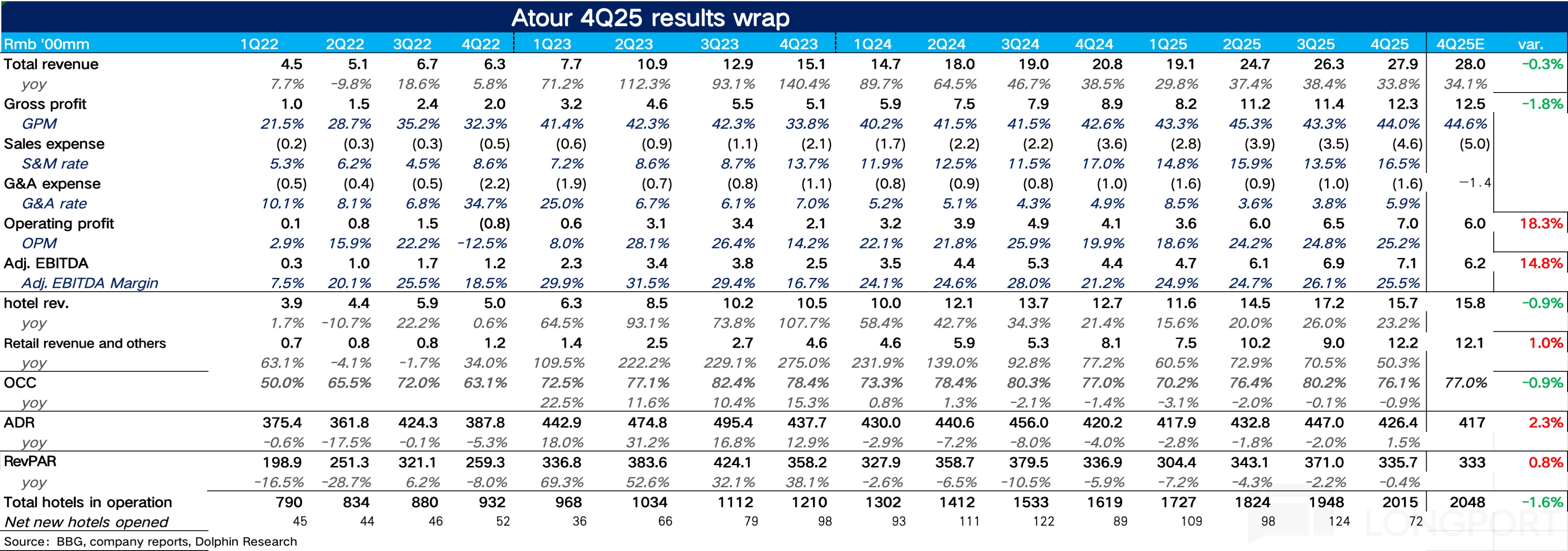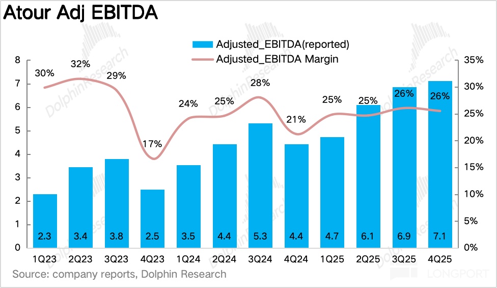 On opex, Atour continued to invest in Douyin/Xiaohongshu traffic in Q4 to build Atour Planet awareness, but scale drove S&M ratio down 50bps to 16.5%. G&A ratio rose temporarily on backend system upgrades and talent investment, yet Adj. EBITDA reached RMB 710mn, +61% YoY, beating Street (RMB 2.34bn).