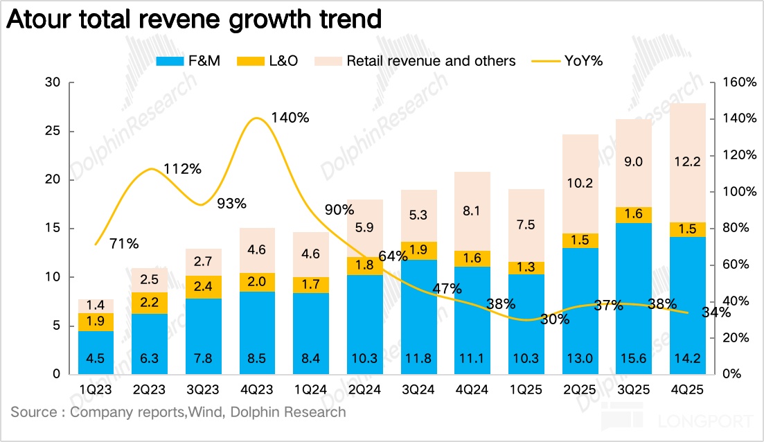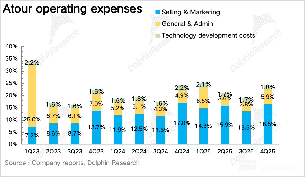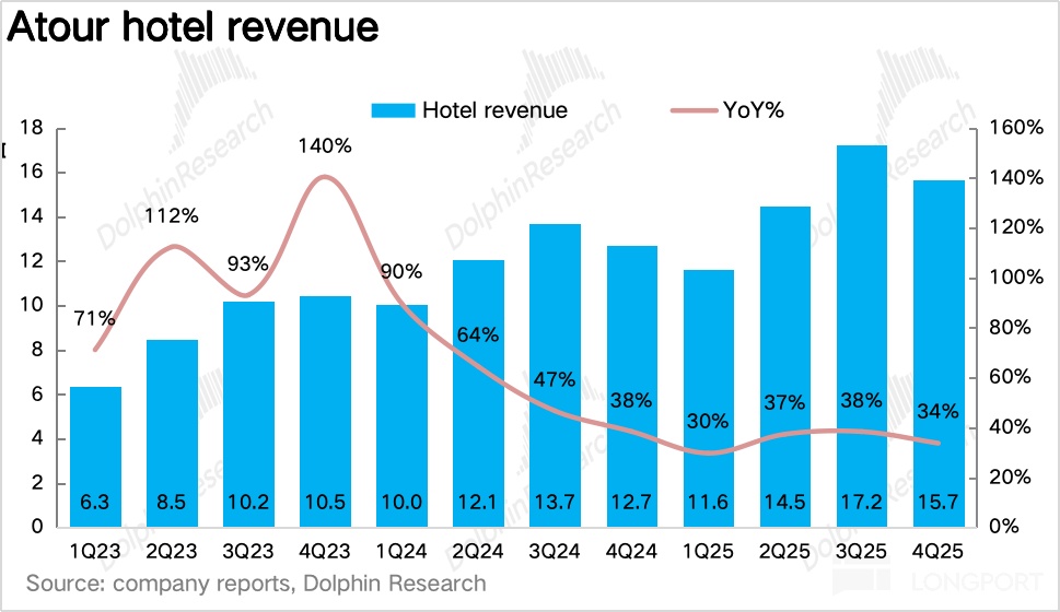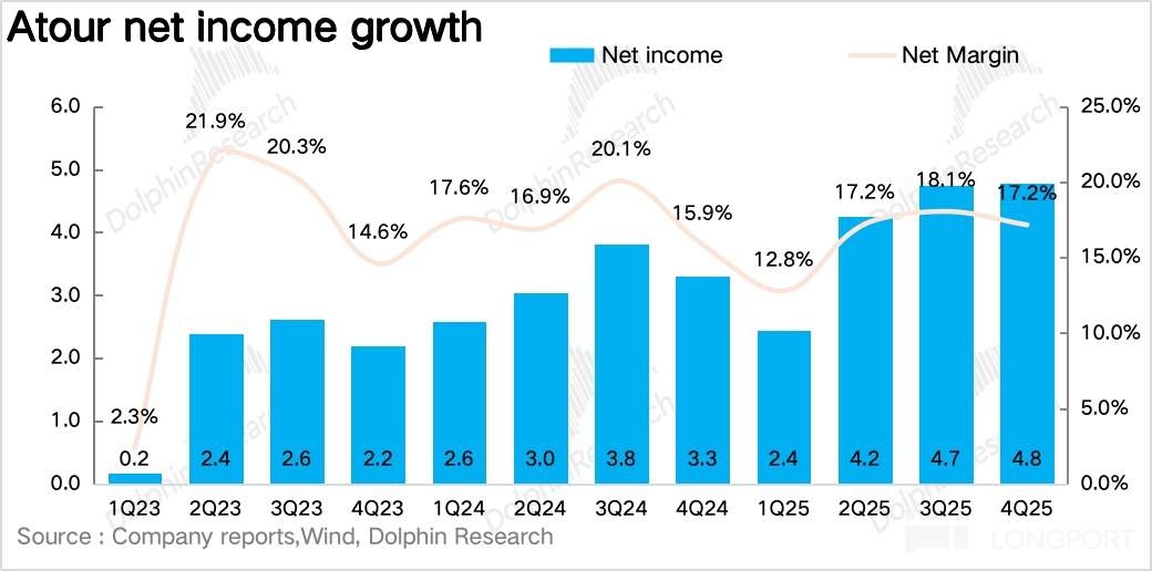 Specifically, after model validation, Atour 4.0 (Jianye) entered scaled rollout in 2025, with 49 adds in Q4 (73% of openings), focused in core districts of tier-1 cities. Dolphin Research believes franchisees sped up year-end signings to capture spring corporate travel.