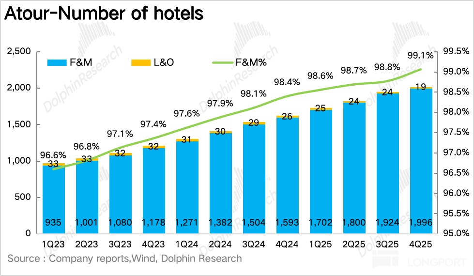 2) Higher mix of 'Qingju'. On openings, Atour had a net add of 67 in Q4, taking the total store count past 2,000, with Atour 4.0 (Jianye) and Qingju as the main drivers. Although the company deliberately slowed openings in the off-season, implied signings trended up QoQ vs. Q3; Dolphin Research believes franchisees accelerated year-end signings of Atour 4.0 (Jianye) to capture spring corporate travel.