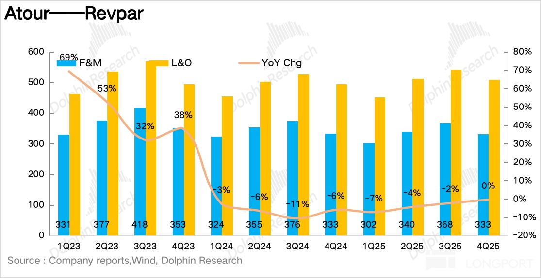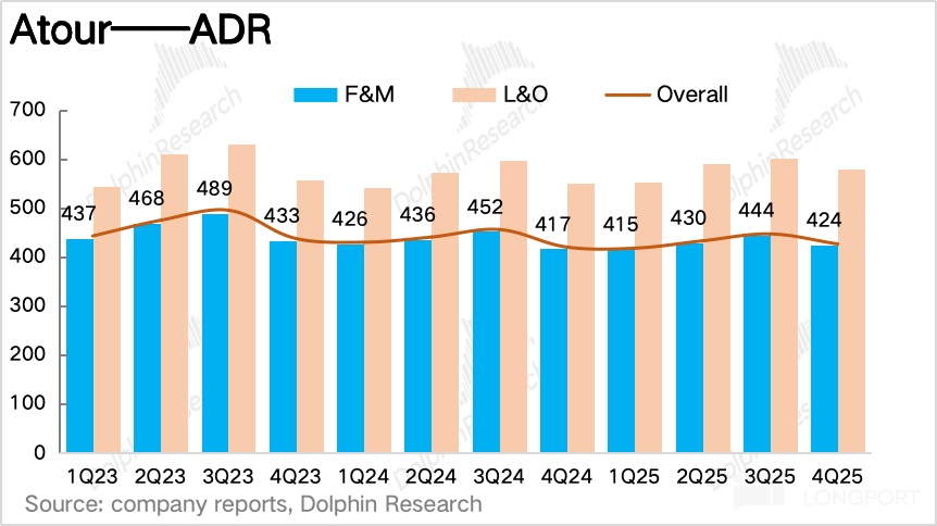 1) Hold price, manage volume; RevPAR slightly beat. On the core KPI RevPAR, Q4 came in at RMB 336 per room-night, down 0.4% YoY with the decline continuing to narrow. With Atour dialing back promos in the off-season and S/X higher-end mix rising, ADR swung back to positive after two years of declines and beat expectations, while OCC softened seasonally and was mediocre.