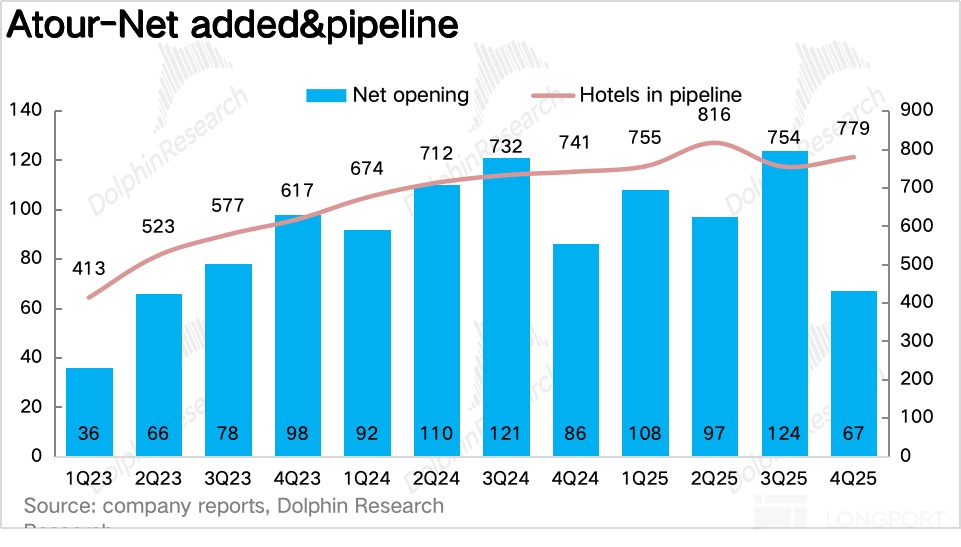 On openings, Atour added a net 67 stores in Q4, taking the total above 2,000, with Atour 4.0 (Jianye) and Qingju as the main contributors.