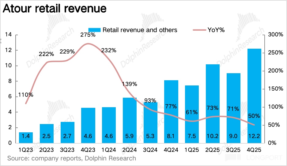 Retail revenue was RMB 1.22bn, +43.9% YoY. Beyond Tmall, Atour’s Douyin live and Xiaohongshu seeding conversion hit record highs in Q4, reaching a large pool of non-hotel customers. Q4 is peak season for down and temperature-regulating duvets, and Dolphin Research believes the GMV mix of temperature-regulating duvets increased, lifting Q4 basket size.