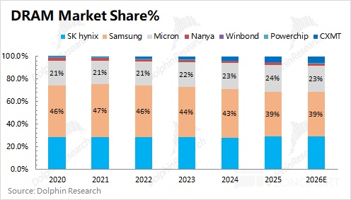 Detail: i) Conventional DRAM delivered the biggest uplift, with an estimated ~$16.0bn in revenue, up over 80% QoQ, as AI demand started to lift DDR products. ii) Dolphin Research estimates HBM revenue at roughly $2.7bn this quarter, up by about $0.5bn QoQ, benefiting from HBM3E/HBM4 ramp and shipments.