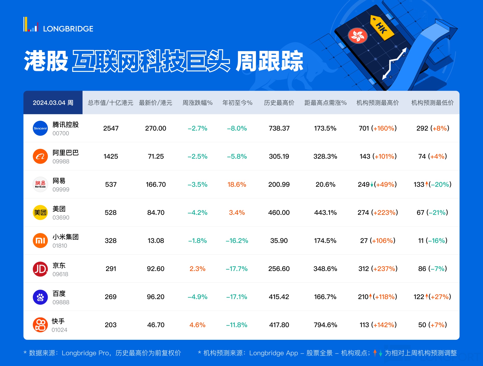 Specifically, among the leading tech companies in the Hong Kong stock market, only Kuaishou-W and JD saw gains for the week, with cumulative increases of 4.6% and 2.3% respectively. BIDU-SW and Meituan both dropped by over 4%, NetEase by over 3%, BABA-SWR and Tencent by over 2%, and Xiaomi by nearly 2%.