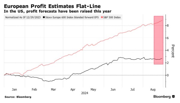 在經歷了一段短暫的跑贏期後,歐洲股市相對於美國股市獲得優勢的希望正在消退,原因是對經濟放緩的擔憂給企業盈利前景帶來了壓力。儘管歐洲斯托克 600 指數創下歷史新高,但在 8 月的表現仍落後於標普 500 指數,且在 2024 年截至目前已落後約 9 個百分點。投資者更傾向於美國市場,尤其是在預期降息的影響下,這使得原本看好的歐洲市場變得不樂觀。