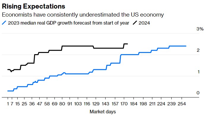 其次,經濟學家和策略師們一直錯誤地判斷了美國經濟的實力。在 2023 年初,經濟學家的預測中值顯示,他們認為美國經濟勉強能撐過 2023 年。但事實情況與此相反,美國經濟增長了 2.5%,而且看起來今年有望再次達到這一水平。大部分預測錯誤可能是過度依賴舊的經驗法則,包括美聯儲加息通常會導致經濟衰退的觀點。在 “正常” 的經濟週期中,這可能是正確的,但在疫情之後,美國經濟的現實情況是僱主囤積勞動力,消費者不顧一切地回到餐館和音樂會,而且房屋淨值很高。經濟學家可能還低估了人工智能軍備競賽帶來的資本支出以及拜登總統的產業政策對宏觀經濟的影響。