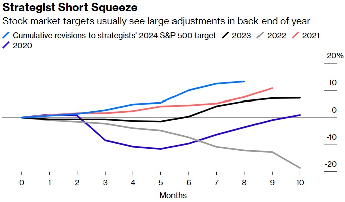 智通財經獲悉,美國市場與經濟專欄作者 Jonathan Levin 表示,自疫情以來,華爾街策略師在年初時的年度預測中一再低估了美國股市的表現,進而促使他們在下半年接近年底的時候瘋狂調高對美股的年度目標預測。一連串的向上修正可能看起來有點像 “軋空”,這是一種交易員被迫快速連續回補看跌押注的情況,通常會加強證券的上行勢頭。從這個意義上説,策略師們今年已經經歷了 10 年來最大規模的軋空,而季節性趨勢表明,未來幾個月這種情況可能將持續下去。