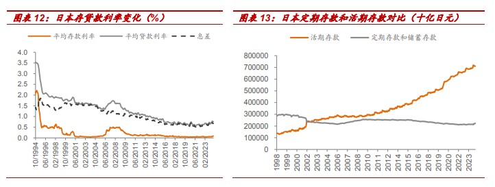 長期看,政策利率中樞下行背景下,存貸款利率均呈下行趨勢,淨息差收窄。存款利率從 2% 以上降至幾乎為 0,貸款利率從 4% 以上降至 0.56%,淨息差從 1.8% 以上,收窄至最低時的 0.51%。貸款利率下行反映了 90 年代地產泡沫破滅之後,企業資產負債表衰退,融資需求不足。