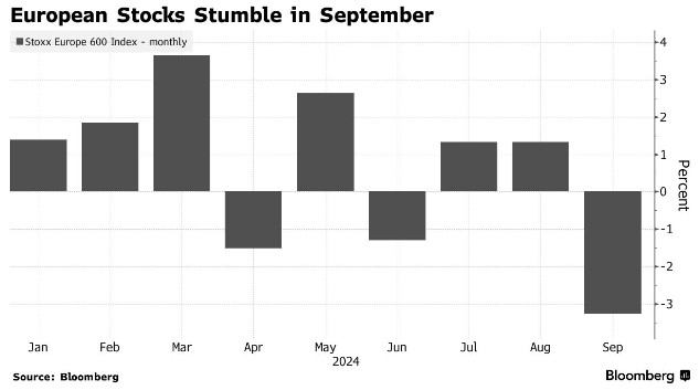 由於對全球經濟增長的擔憂打壓了與經濟週期和石油等大宗商品相關的股票,歐洲基準股指在 8 月份反彈後,本月出現下跌。預計歐洲央行將在週四的會議上降息,這將是本週期內的第二次降息,因該地區經濟難以保持增長勢頭。