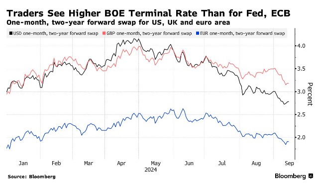 市場目前預計英國央行將在 9 月 19 日的決定中維持利率不變,並在 11 月和 12 月分別降息 25 個基點。瑞銀駐倫敦首席策略師 Bhanu Baweja 認為,英國官員停止猶豫,對經濟面臨的危險做出更緊迫的回應,只是時間問題。