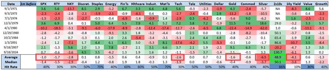 降息 50 基點的三個月後,標普 500 指數基本沒有變化(除了 2007 年、2001 年和 1974 年,當時標普 500 指數遭遇了重創)。相反,小盤股平均上漲了 5.6%。科技股表現良好,價值股再次跑贏成長股,美元上漲,金屬價格飆升,收益率曲線呈牛市陡峭化趨勢。