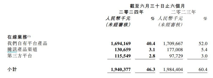 拆分來看,網文的在線業務收入為 19.4 億元,同比下滑 4.8%,略低於市場預期,該業務佔總收入的 46.3%,較去年同期的 6 成份額有所下滑。其中,閲文自有平台收入為 16.94 億元,同比下跌 4%;騰訊產品自營渠道為 1.31 億元,同比下跌 26.2%;