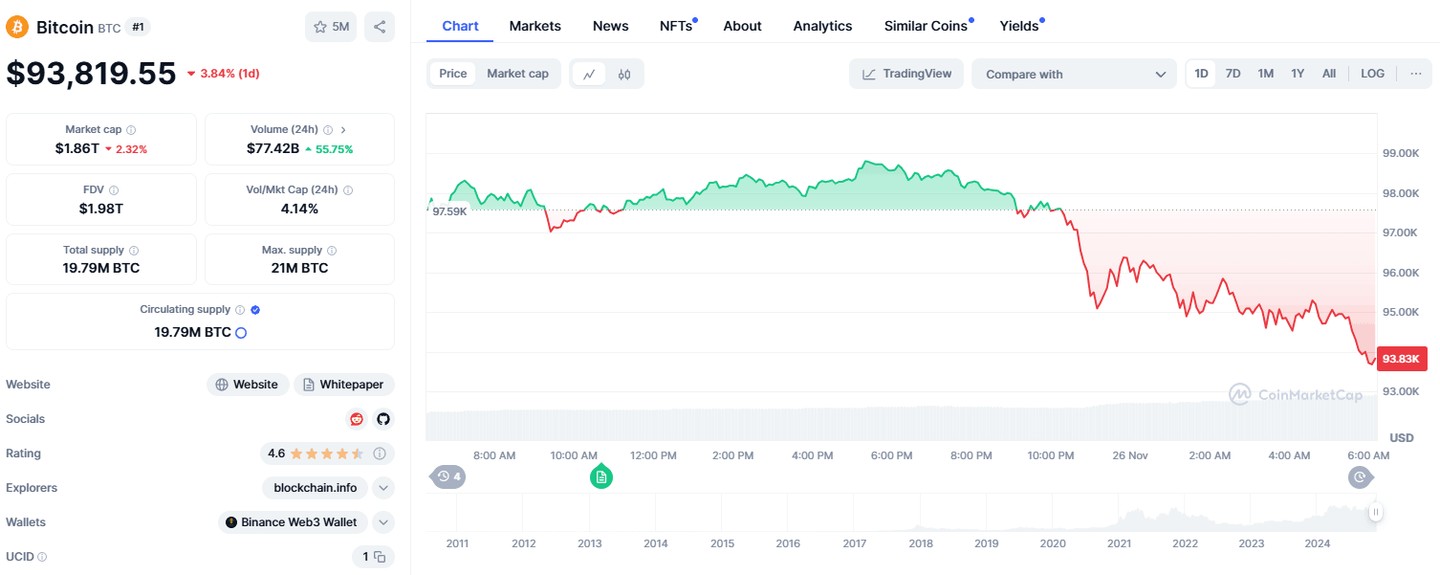 11 月 25 日周一,比特币延续周末期间的下跌,继续走低,盘中跌穿 9.4 万美元。比特币上周冲击 10 万美元大关未果,获利了结情绪浓烈,目前已较历史高点累计下跌约 6000 美元,跌破 11 月 21 日底部 93850.62 美元。