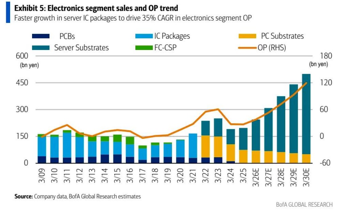 According to the Zhitong Finance APP, a recent research report released by Wall Street investment giant Bank of America shows that the operating profit compound annual growth rate (CAGR) of the electronic components business under Ibiden, a leading semiconductor packaging equipment company headquartered in Japan, could reach 35% over the next five years. Additionally, the EPS forecast for the fiscal year ending 2028 has been significantly raised. The main logic behind this is the explosive demand for GPU packaging substrates (i.e., ABF advanced packaging substrates) provided by Ibiden for the massive expansion of AI chip production capacity, driving a substantial increase in both volume and price of ABF.