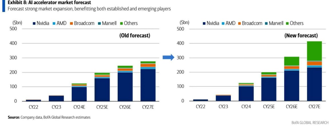 The predictive data from the Bank of America analysis team indicates that the sales of AI chips, including GPUs, ASICs, and other XPUs, will grow from just $126 billion in 2024 to over $400 billion by 2027, and will reach at least $650 billion by 2030. Although NVIDIA's AI GPUs dominate the market with nearly 80% market share, Bank of America predicts that by 2030, the customized, high-performance, and low-cost characteristics of the ASIC ecosystem will account for nearly 20% of the market share