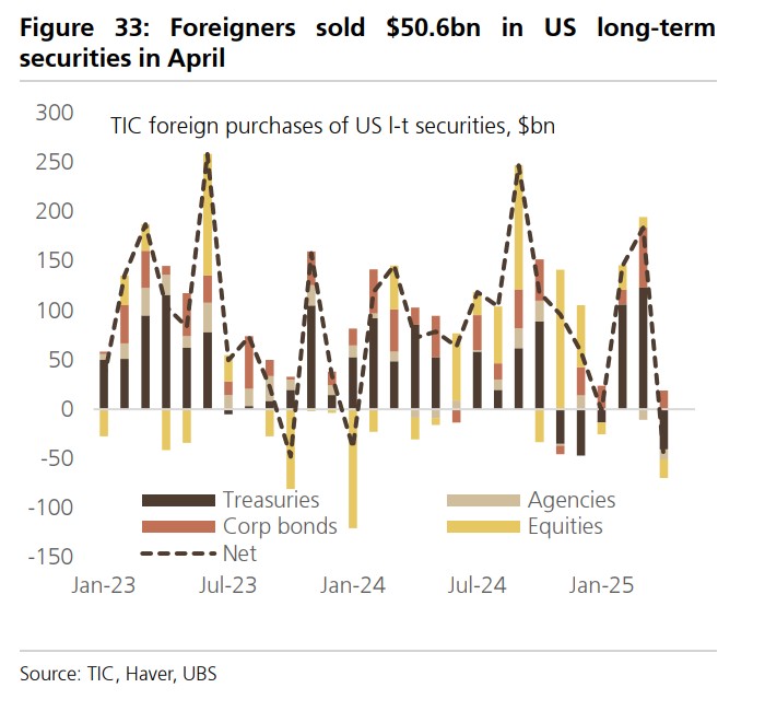 UBS stated that the U.S. TIC data for April provided evidence of a sell-off of U.S. assets, but it is unclear whether this rotation continued beyond April. The data showed that foreign investors net sold $50.6 billion in U.S. long-term securities, including $18.8 billion in stocks and $40.8 billion in government bonds.