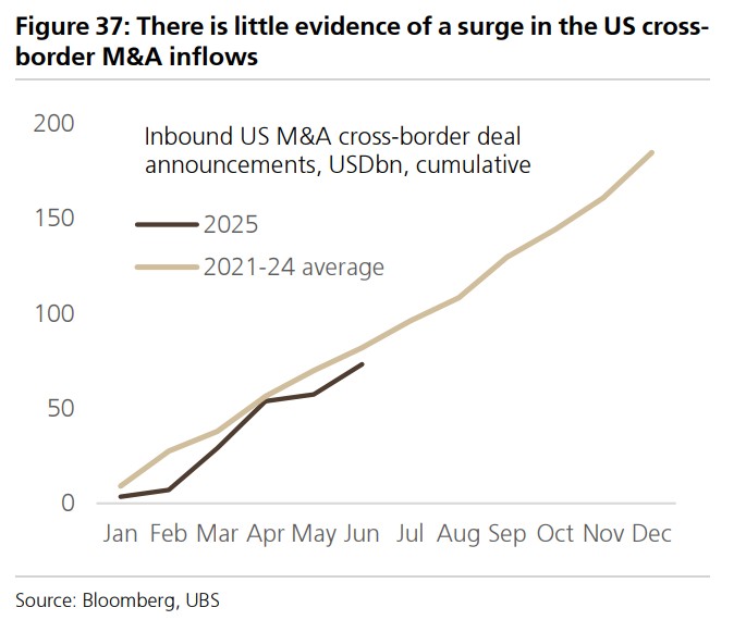 UBS stated that so far, there has been no clear evidence in merger and acquisition announcement data to verify the federal government's claim of over $10 trillion in FDI investment commitments flowing into the U.S.