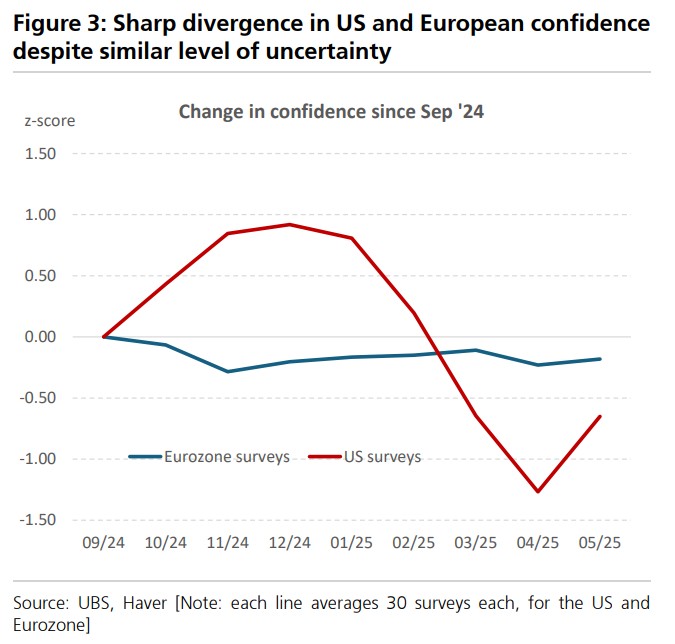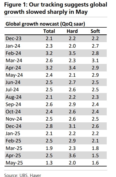 UBS indicated that in April, following the announcement of tariffs, there was a sharp divergence between global hard data and soft data (reaching the highest gap in 27 years), with hard data showing an annualized growth of 3.6%, while soft data only indicated 1.3%. However, starting in May, the two began to converge, as the deterioration of hard data was faster than the improvement of soft data.