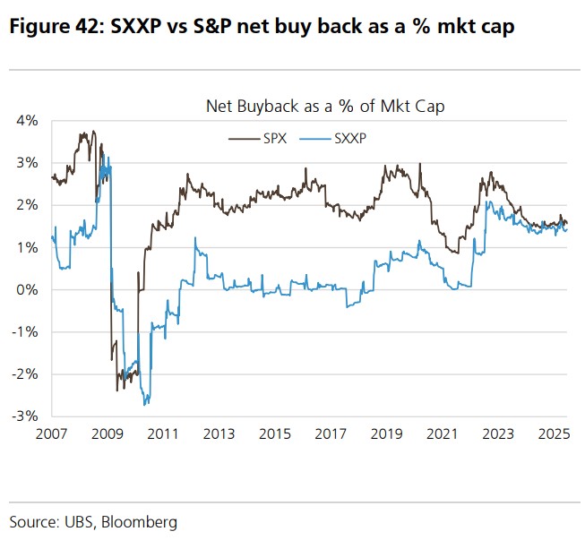UBS states that the areas where the U.S. is no longer "exceptional" compared to the Eurozone include: buybacks (as a percentage of market value) and GDP growth (slightly lower than the EU in 2026).