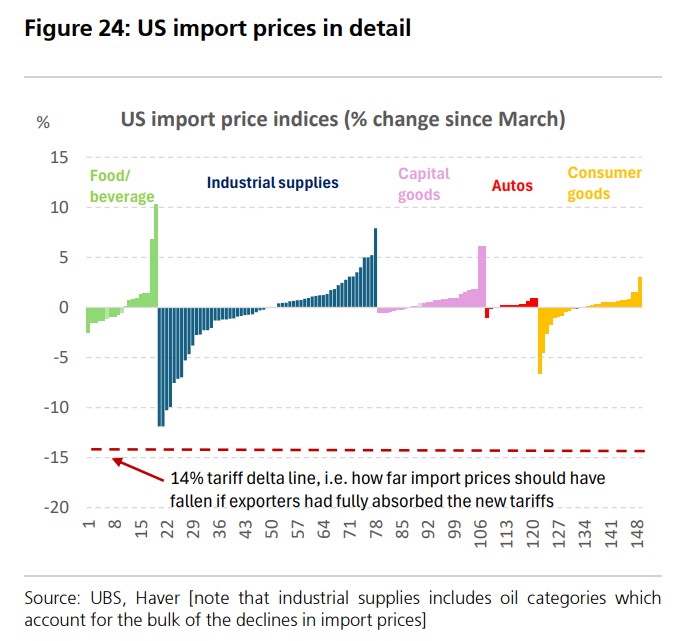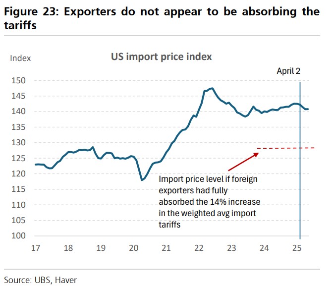 UBS believes that foreign exporters may indeed have absorbed the impact of the U.S. dollar depreciation on their profits, while U.S. importers bear the majority of the tariff costs. Currently, there are no clear signs of transshipment, but it is still too early to tell.