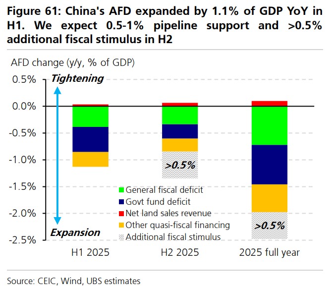 UBS estimates that China's broad fiscal deficit expanded to 1.1% of GDP year-on-year in the first half of the year. It is expected that the remaining planned fiscal stimulus (0.5-1% of GDP) will be delivered in the second half of the year, and additional fiscal stimulus exceeding 0.5% of GDP may be introduced, potentially at the end of the third quarter.