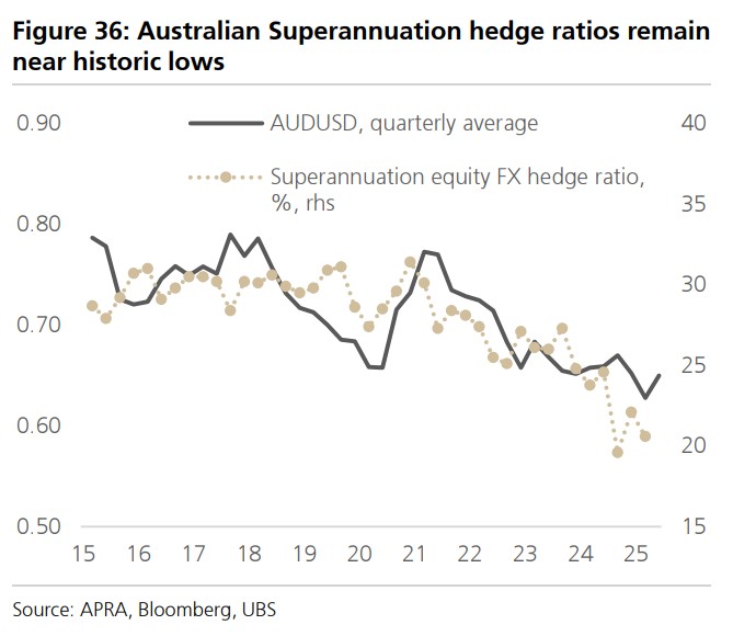 UBS believes that the continued depreciation of the dollar may reflect that global investors have increased their foreign exchange hedging ratio for U.S. assets. The foreign exchange hedging data from Australian and Canadian pension funds shows that the current hedging ratio remains at historically low levels, with room for further increases.