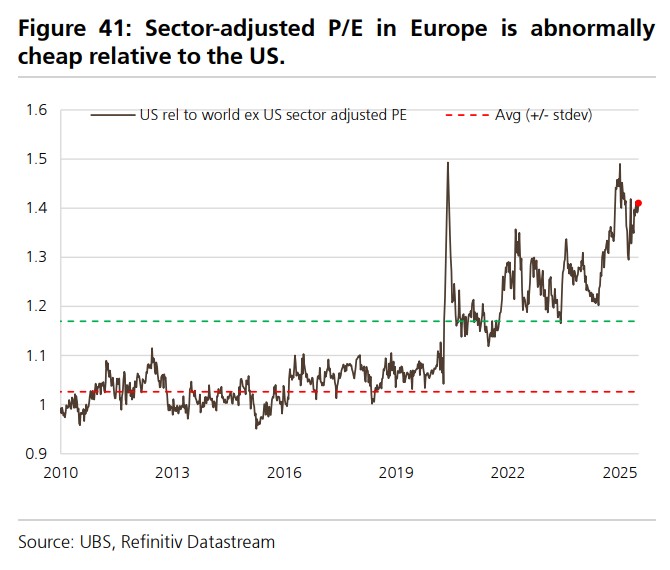 The U.S. stock market's price-to-earnings ratio adjusted for sectors is 25% higher than that of Europe, while the historical average is only 7%.