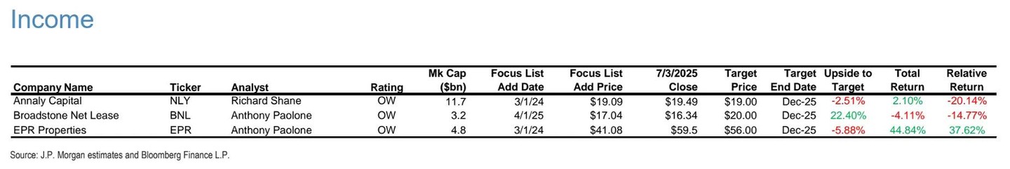 Under the income strategy, JP Morgan analysts focus on U.S. stocks including: Annaly Capital Management (NLY.US), Broadstone Net Lease (BNL.US), EPR Properties (EPR.US), all of which are real estate investment trusts.