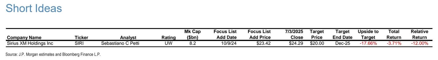 Under the short selling strategy, JP Morgan analysts focus on the U.S. stock Sirius XM (SIRI.US).