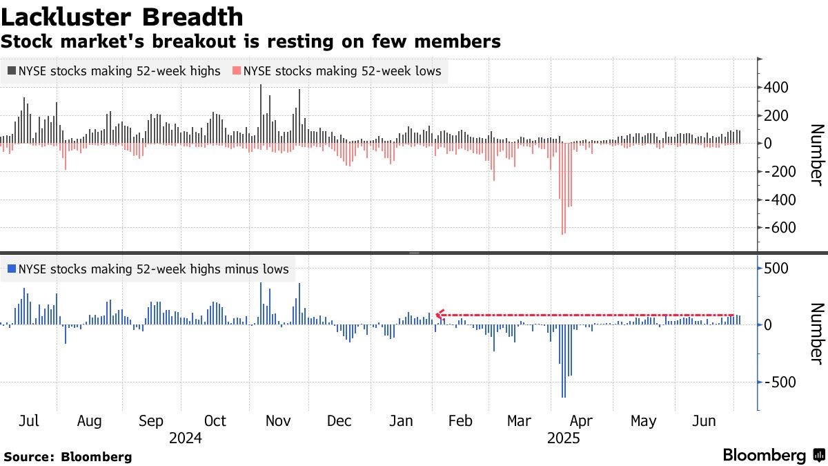 According to Zhitong Finance APP, as the S&P 500 index continues to hit historical highs recently, the number of individual stocks reaching new highs in the market is few, which is not a good sign for traders worried about the increasing concentration of the market in a few large technology stocks.