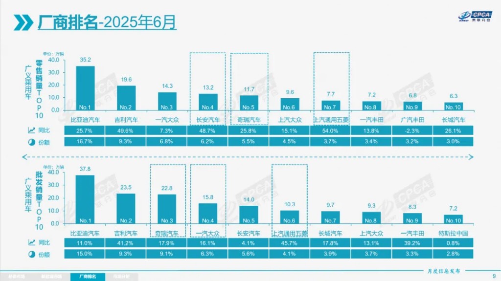In June, the wholesale share of domestic brand passenger cars was 67.1% (up 2.2% year-on-year), and the domestic retail share was 64.2% (up 5.6% year-on-year), showing significant improvement in joint ventures.