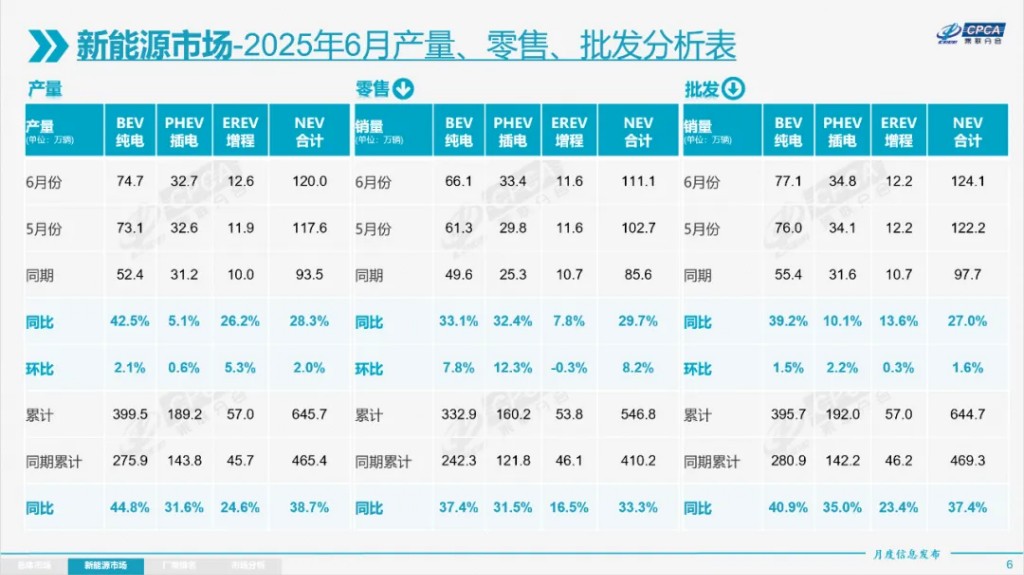 In June, the retail sales of new energy passenger vehicles reached 1.111 million units, a year-on-year increase of 29.7% and a month-on-month increase of 8.2%; the cumulative retail from January to June was 5.468 million units, an increase of 33.3%.