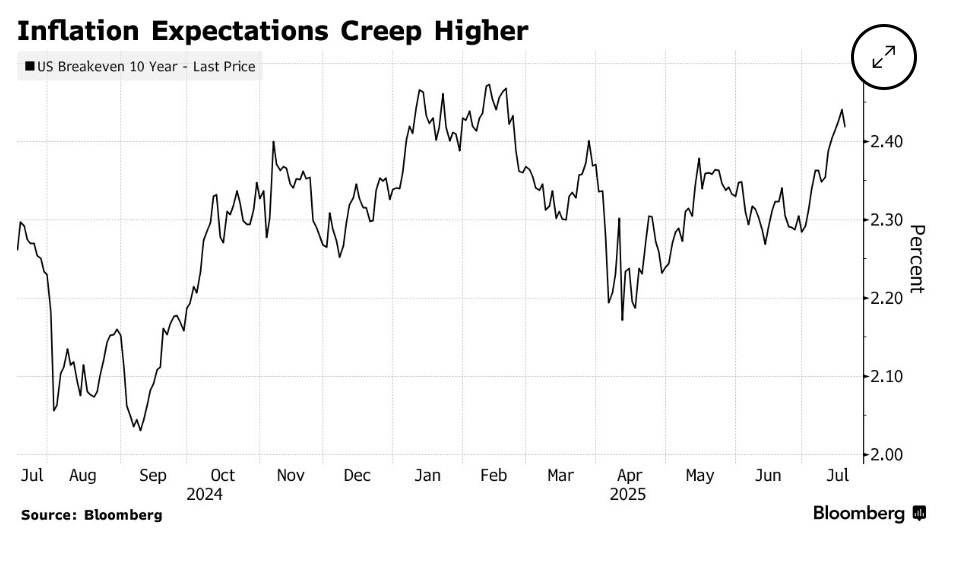However, Megan Swiber, a rate strategist at Bank of America, believes that the hedging effect of "steepening trades" may be limited, as the Treasury may suppress rising yields by controlling the issuance of long-term bonds (the next quarterly refinancing plan will be announced on July 30). She recommends the "breakeven rate" strategy (the difference between the yields of ordinary government bonds and inflation-protected securities), considering it a "cleaner" hedging tool that can effectively capture the potential risks of a dovish Federal Reserve policy pushing up inflation. Currently, the 10-year breakeven rate, which reflects market inflation expectations, has risen to 2.42%, close to the highest level since February, indicating that investors are pricing in the risks to the independence of the Federal Reserve.