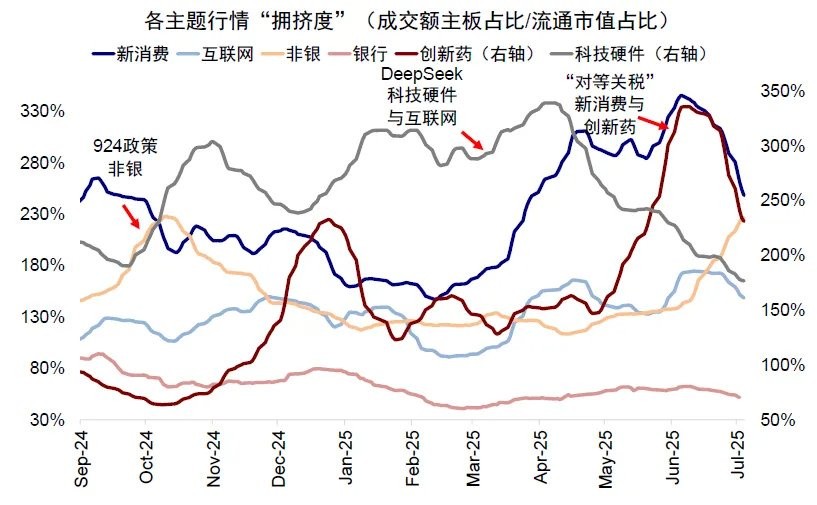 1) Structurally active market that is insensitive to macro factors: Although the overall fundamentals in China are weakening and external disturbances are constant, the structural market remains active, with sectors rising and falling in turn, such as several rounds of main lines like AI, new consumption, and innovative drugs since the beginning of the year;