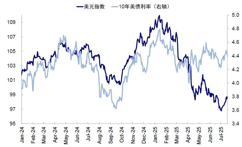 3) Dollar liquidity faces supply pressure in the third quarter. On one hand, after the passage of the "Great Beauty" Act, there will be a peak supply of about one trillion dollars in government bonds in the third quarter, which will push up U.S. Treasury yields (see "U.S. Treasuries, U.S. Stocks, and Liquidity After the 'Great Beauty' Act"); on the other hand, accelerated technology investment, fiscal stimulus, and new highs in U.S. stocks have significantly dispelled concerns about "de-dollarization" and "triple kill of stocks, bonds, and currencies" in mid-April, also supporting the stabilization and even rise of the dollar. This is also a core indication in our outlook for the second half of the year that differs from market consensus (see "Global Market Outlook for the Second Half of 2025: Consensus on 'De-dollarization'", "The Relationship Between U.S. Stocks and the Dollar").