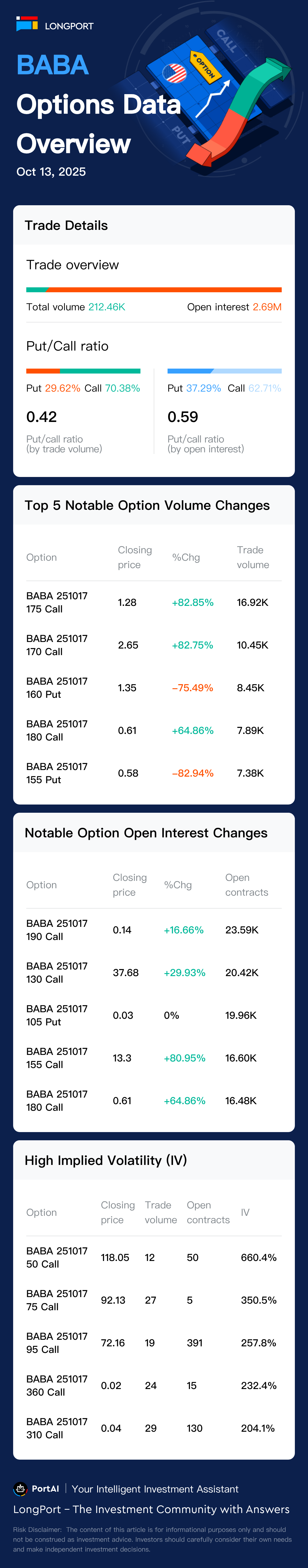 On October 13, Eastern Time, Alibaba options saw a total of 368299 contracts traded, with calls accounting for 73% and puts making up 26%.