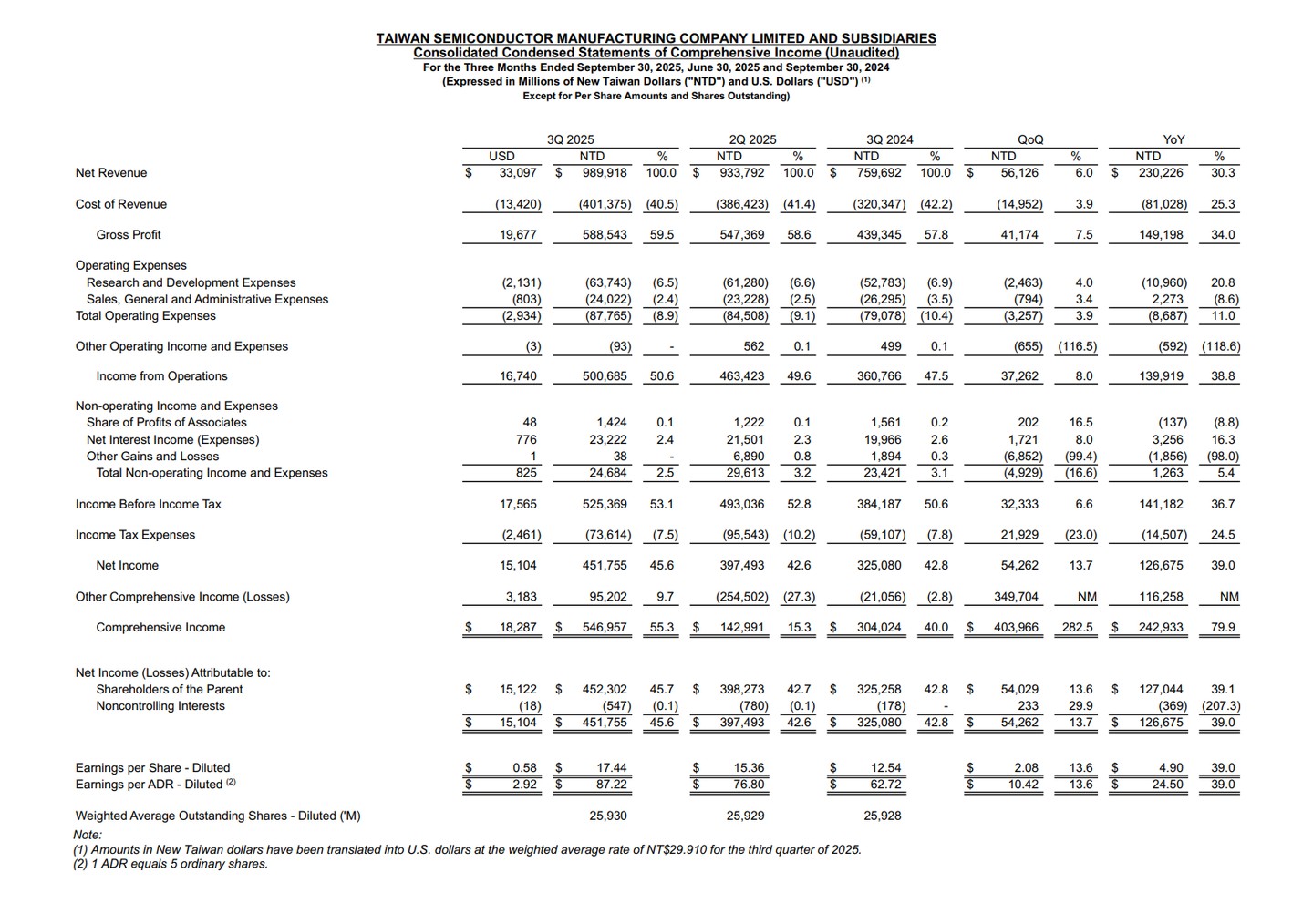 On Thursday, Taiwan Semiconductor announced its third-quarter financial report, with a net profit of NT$452.3 billion in Q3, a year-on-year increase of 39%, exceeding the estimated NT$405.47 billion; the gross profit margin for the third quarter was 59.5%, continuing to improve from 58.6% in the previous quarter, and higher than the analyst estimate of 57.1%. The operating profit margin reached 50.6%, an increase of 1 percentage point from the previous quarter, surpassing the market expectation of 47.3%.