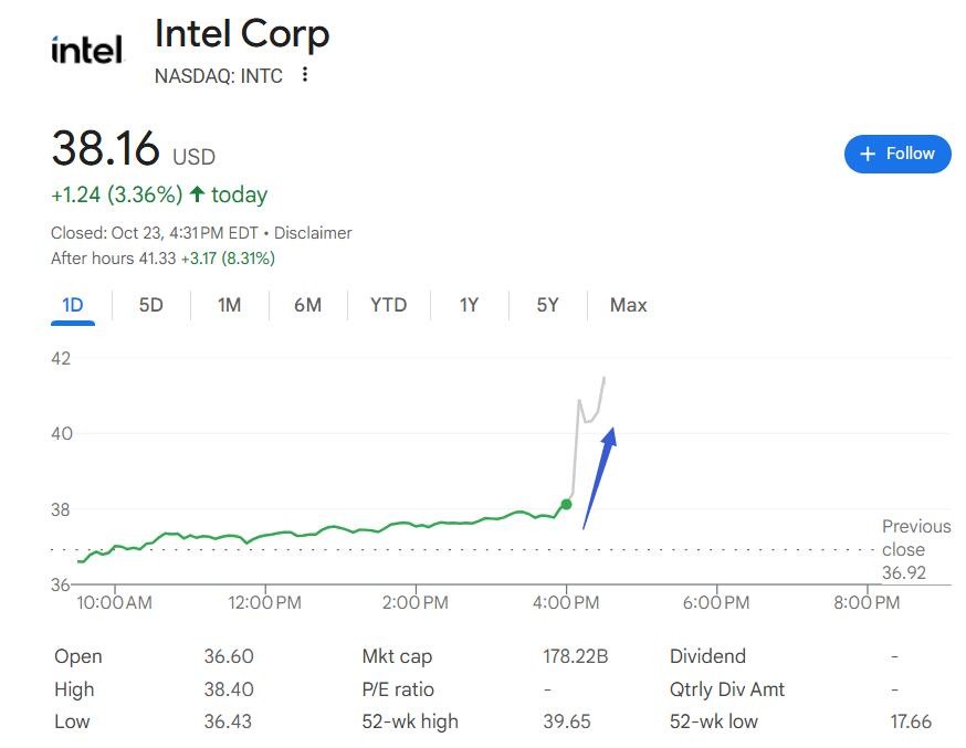 After the earnings report was released, Intel's stock price rose about 3.4% on Thursday and further surged in after-hours trading, at one point increasing by 9%. Over the past three months, Intel has received a series of investment or equity commitments from SoftBank, the Trump administration, and NVIDIA. Since announcing a $2 billion investment agreement with SoftBank on August 18, Intel's stock price has cumulatively risen over 30% as of Wednesday's close, with an overall increase of 86% this year.