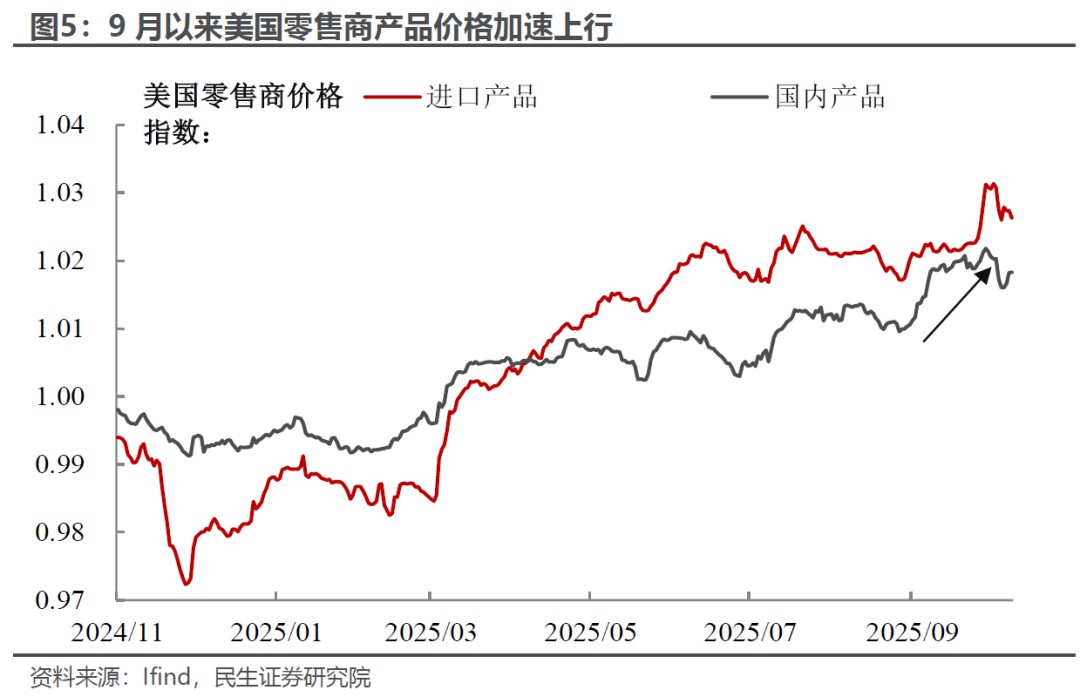 On the other hand, the impact of tariffs on commodity price increases is becoming more evident. According to the product prices of major U.S. retailers (calculated by Harvard University), retail prices of imported related goods in the U.S. rose again in September, with the scope and intensity of tariff impacts on prices expanding. It is expected that imported related goods such as furniture, clothing, and leisure products will maintain moderate growth month-on-month.