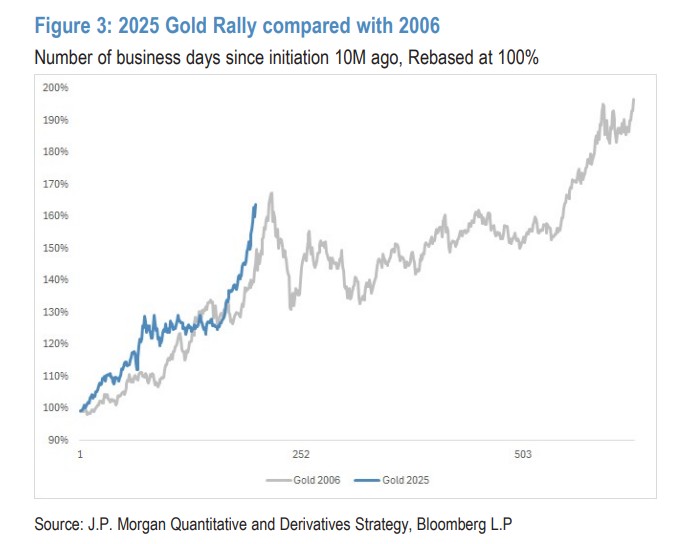 JP Morgan's global quantitative team compared this rapid rise in gold to the situation in May 2006, when gold prices experienced a 30% pullback within a month after a significant increase, suggesting a historical pullback risk.