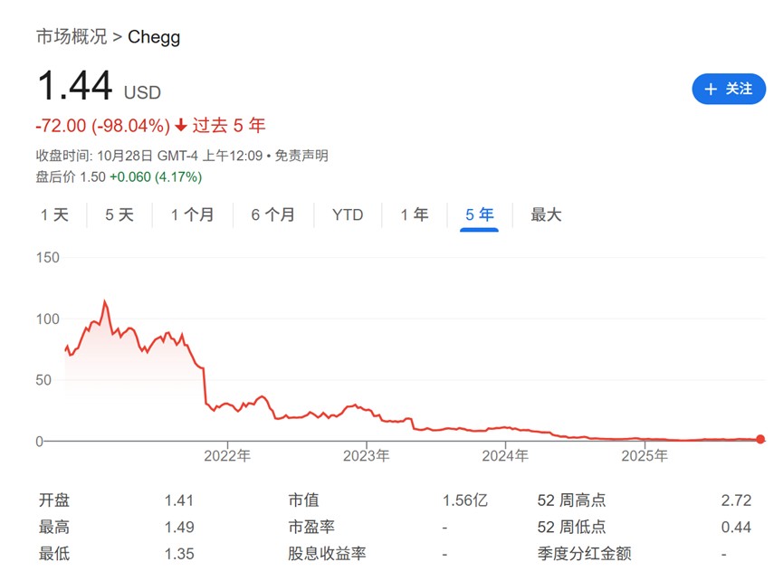 Behind these drastic upheavals is the collapse of Chegg's market value. The company's stock price has plummeted 99% from its historical high of $113.51 in February 2021, with its market value evaporating from a peak of about $14.7 billion to approximately $156 million. Once a Wall Street star, it is now struggling to adapt to the AI era.