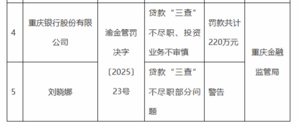 According to the administrative penalty information disclosed by the Chongqing Regulatory Bureau of the National Financial Supervision and Administration in late October, Chongqing Bank Co., Ltd. was fined a total of 2.2 million yuan for violations related to negligence in the "three checks" of loans and imprudent investment business.