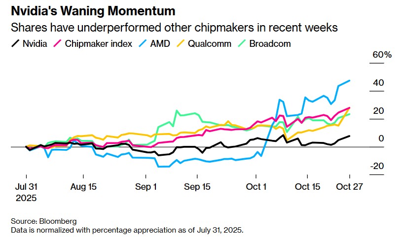 NVIDIA's momentum seems to be waning — the stock has underperformed other chip giants in recent weeks