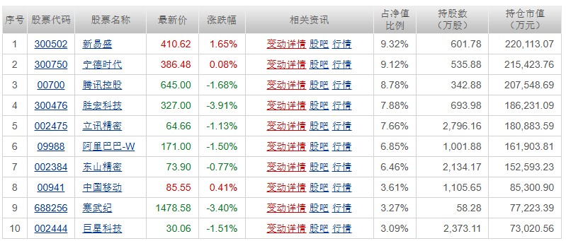 Among the top ten heavy stocks in the fund's third-quarter report, three stocks doubled in price during the third quarter, namely Xinyi Sheng (300502.SZ), Shenghong Technology (300476.SZ), and Cambricon (688256.SH). However, the fund managers reduced their holdings in these stocks. Similarly, they also reduced their positions in CATL (300750.SZ), Tencent Holdings (00700), Luxshare Precision (002475.SZ), China Mobile (00941), and Juxing Technology (002444.SZ); Alibaba (09988) and Dongshan Precision (002384.SZ) saw increased holdings.